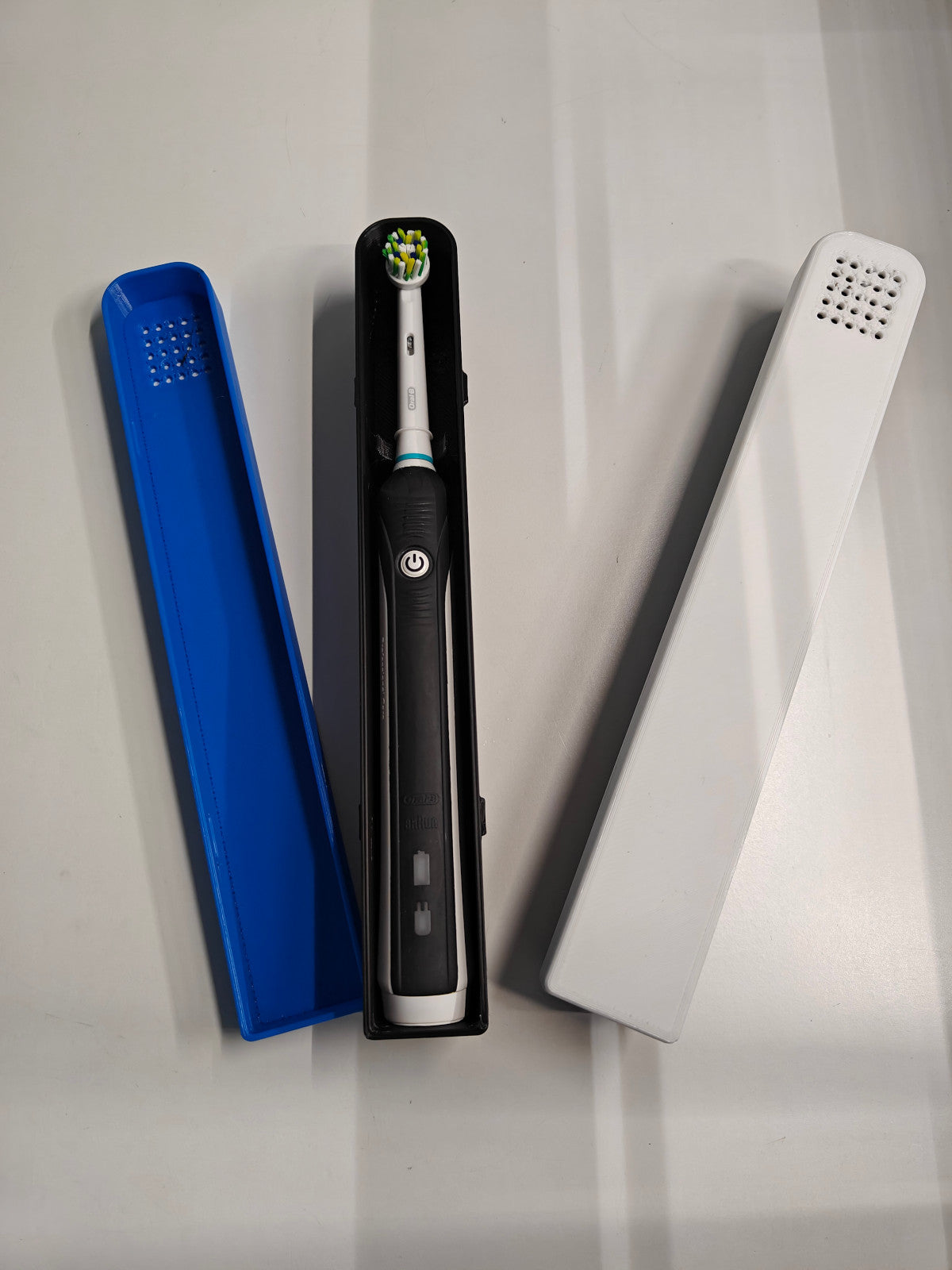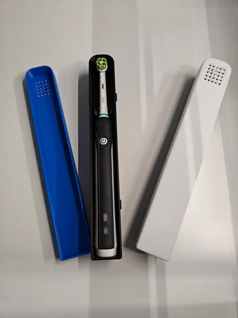 Ontdek deze praktische reisetui, gemaakt om uw Oral-B elektrische tandenborstel te beschermen tijdens reizen of voor georganiseerde opslag thuis. De etui is ontworpen om de tandenborstel veilig op zijn plaats te houden met een eenvoudige klikfunctie die stabiliteit garandeert en beweging voorkomt. Het deksel klikt veilig op zijn plaats, wat een robuuste bescherming biedt tegen invloeden van buitenaf. Wanneer u uw tandenborstel nodig hebt, is deze gemakkelijk te verwijderen met een simpele druk. De nieuwste versie van de etui bevat een verbeterde bodem met een smallere en flexibelere houder, die de pasvorm en weerstand tegen dagelijks gebruik en eventuele schokken verder optimaliseert.
