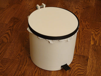 Dit is een bedrukbare pedaalbediende prullenbak. De inhoud is ongeveer 7,5 liter.