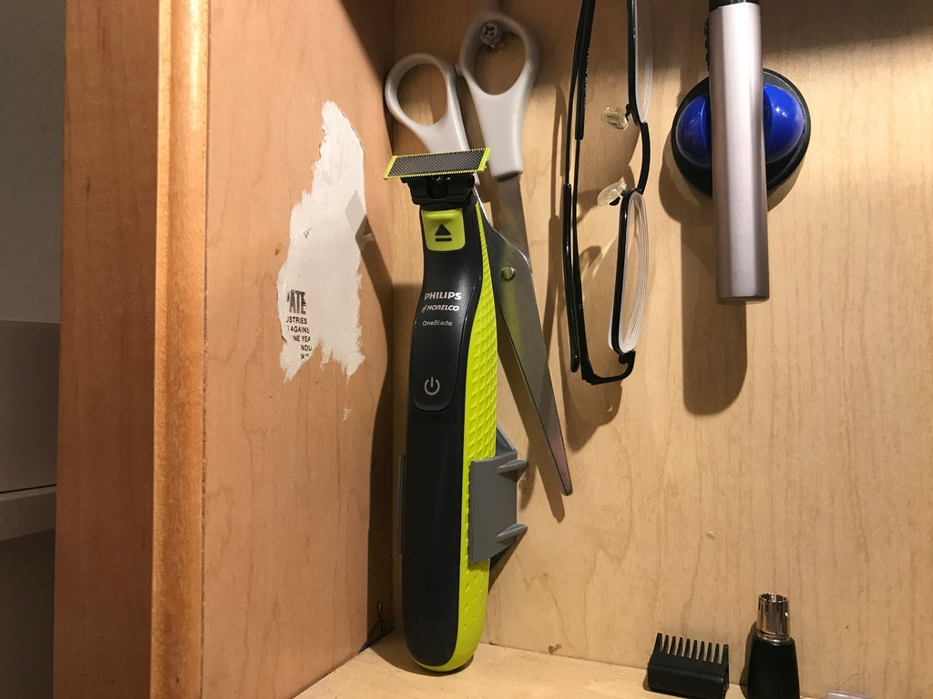 Het eerste onderdeel is een wandmontage die eenvoudig met twee schroeven in een kast of aan een muur kan worden bevestigd. Deze discrete opbergoplossing zorgt ervoor dat je OneBlade is opgeborgen wanneer deze niet in gebruik is, maar nog steeds gemakkelijk te vinden is wanneer je je moet scheren.