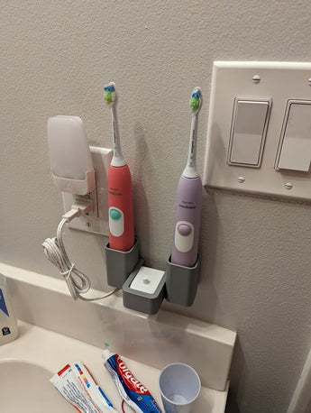 Deze functionele houder is ontworpen om uw Philips Sonicare tandenborstels en oplader effectief te organiseren. Het biedt ruimte voor twee tandenborstels en een speciale ruimte voor uw oplader in het midden. De oplaadopening zorgt voor een stevige grip zonder beweging, zodat uw oplader altijd stabiel geplaatst is. Een slimme uitsparing aan de achterkant zorgt ervoor dat de kabel discreet kan worden weggeleid, wat bijdraagt aan een opgeruimde badkamer. Met binnenmaten van 32,5 mm x 32,5 mm past de houder op een breed scala aan Philips Sonicare modellen, waaronder HX6250 en HX686W, waardoor het een veelzijdige keuze is voor uw Philips accessoires. U kunt ervoor kiezen om de houder aan de muur te bevestigen met dubbelzijdige plakstrips om ruimte te besparen, of hem gewoon stabiel op een aanrecht plaatsen, aangezien hij een vlakke en evenwichtige bodem heeft. Deze oplossing helpt om uw Philips Sonicare chargers en tandenborstels bij elkaar te houden en gemakkelijk toegankelijk te maken.