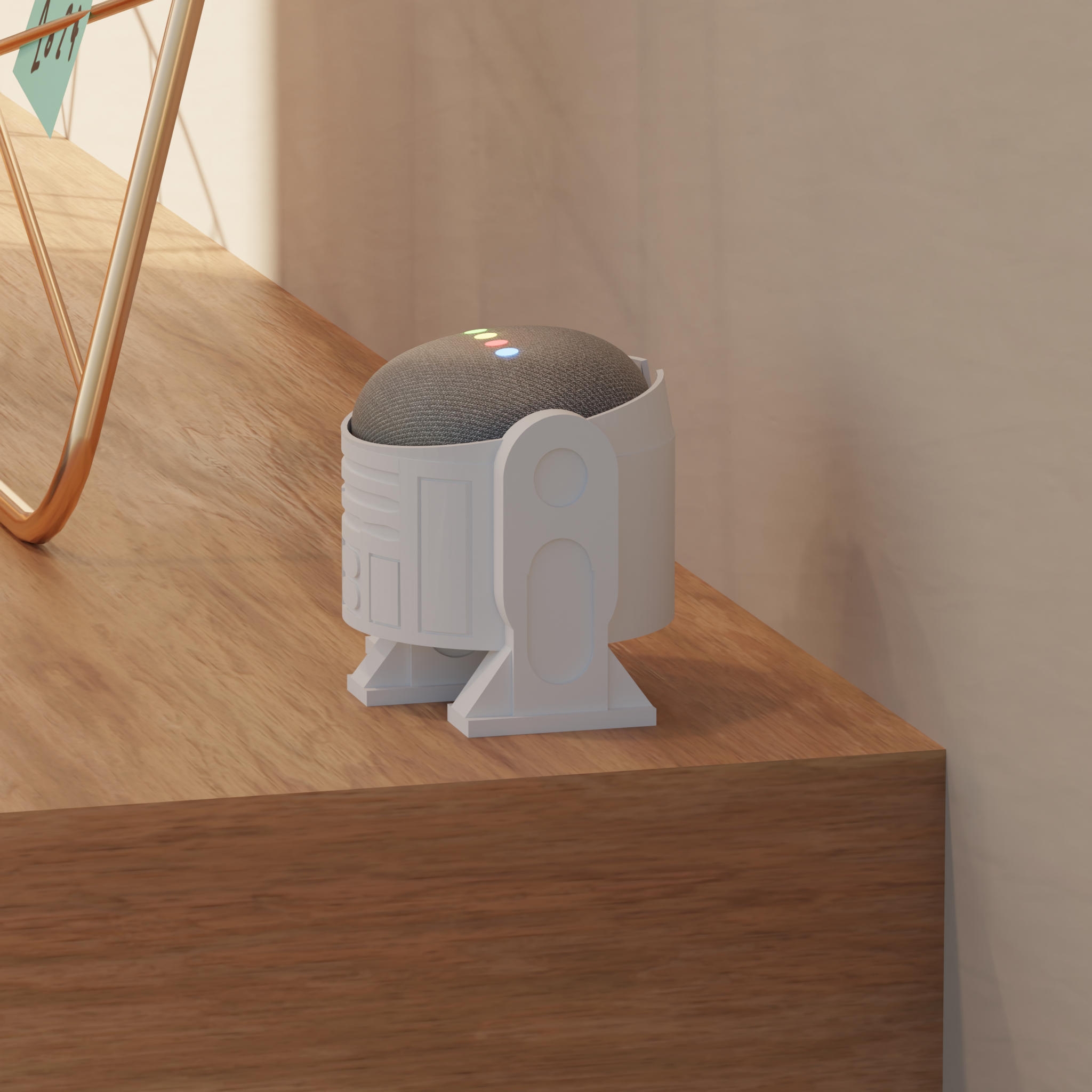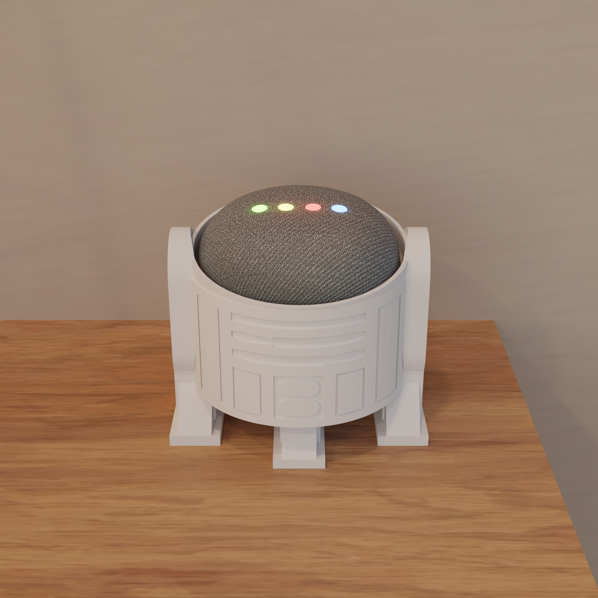 Leuke houder voor een Google Nest Mini 2e generatie, ontworpen als R2D2 uit Star Wars.