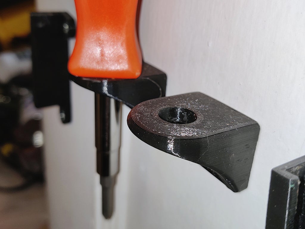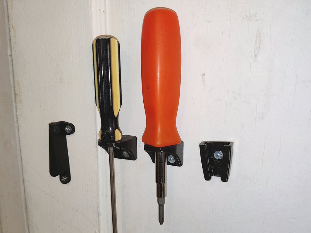 Dit is een eenvoudige muurbevestiging voor schroevendraaiers. Hij kan worden bevestigd met twee #8 of #6 schroeven met verzonken kop. Er zijn geen steunen nodig.