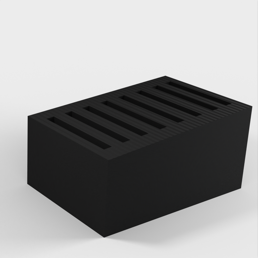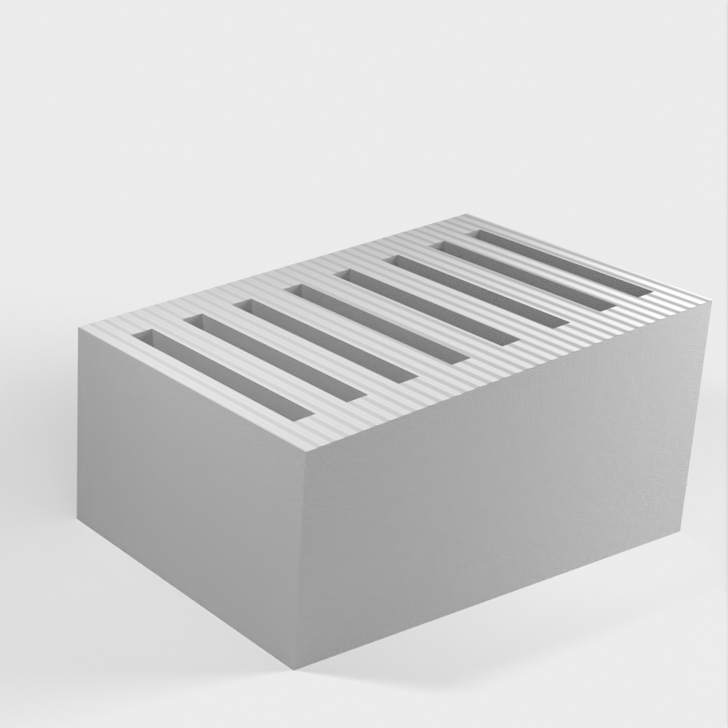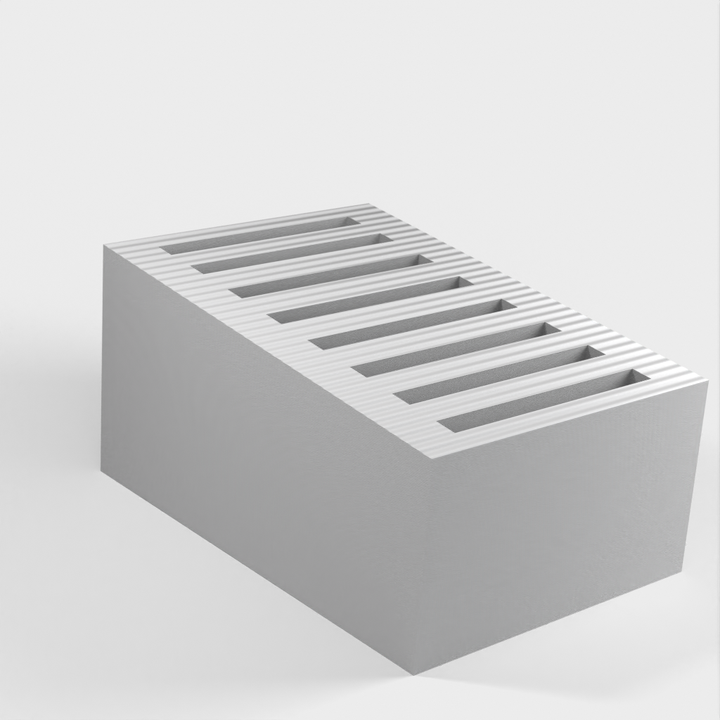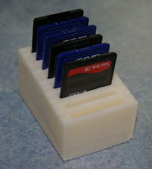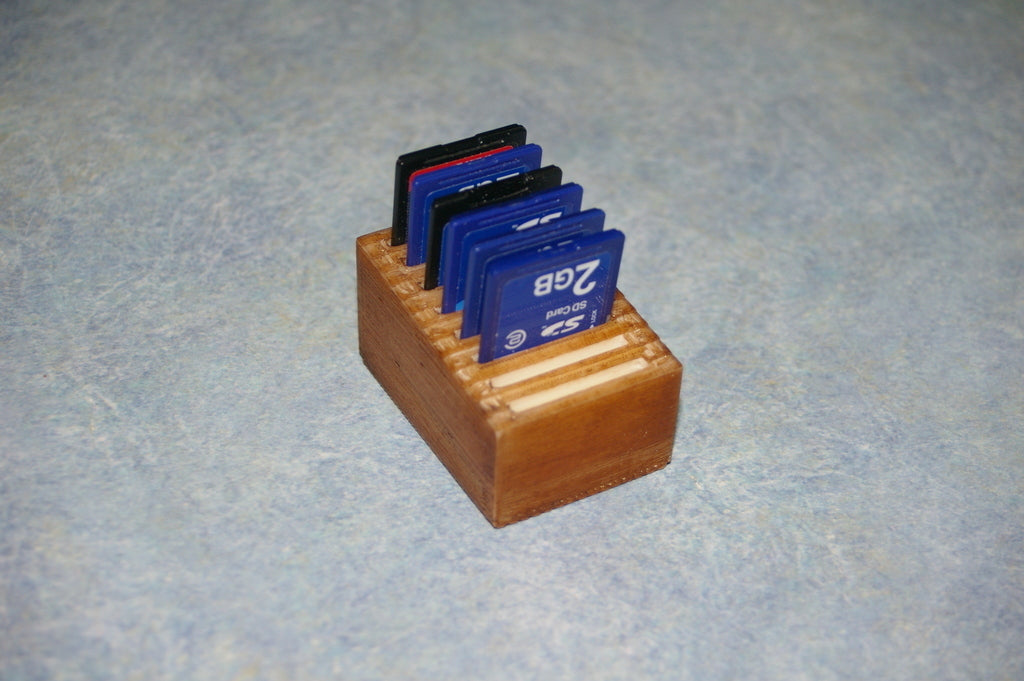 Dit is een eenvoudige SD-kaarthouder waar maximaal 8 SD-kaarten in passen. De sleuven zijn een beetje krap om te voorkomen dat de kaarten eruit vallen als je de houder omkiept. Verder heeft de SD-kaarthouder een heel eenvoudig ontwerp.
