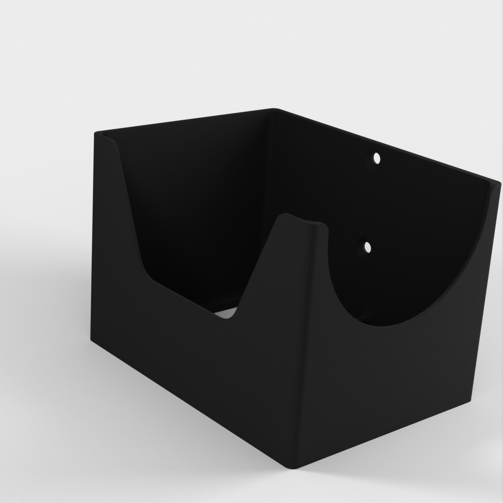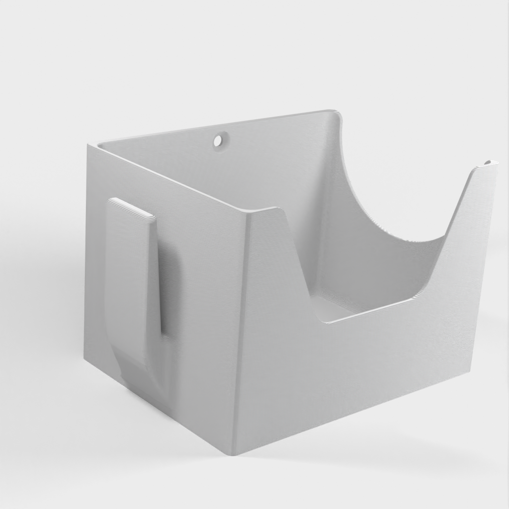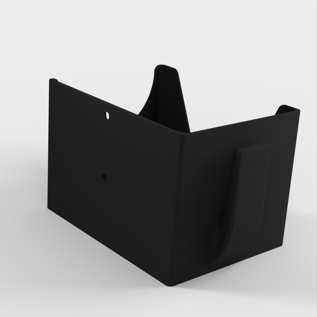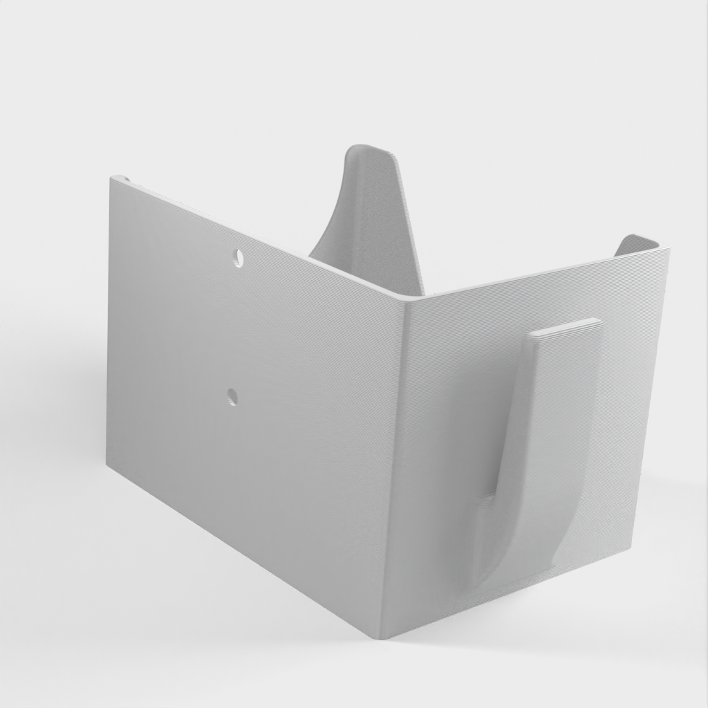 De houder kan met 1 of 2 schroeven aan de muur worden bevestigd en bevat een back-up haak voor de nekriem voor het geval deze uit je hand glipt wanneer je hem in de houder doet of uit de houder haalt. (Het is belangrijk dat je eerst de nekriem omdoet om deze redundantie beperking effectief te laten zijn).