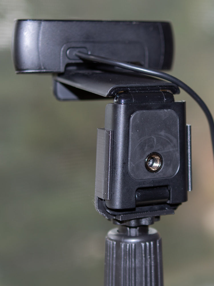 Statiefadapter voor een Logitech C920/C930 camera, waarmee je hem op een microfoonstatief kunt plaatsen, zodat hij vrij op en neer kan bewegen.