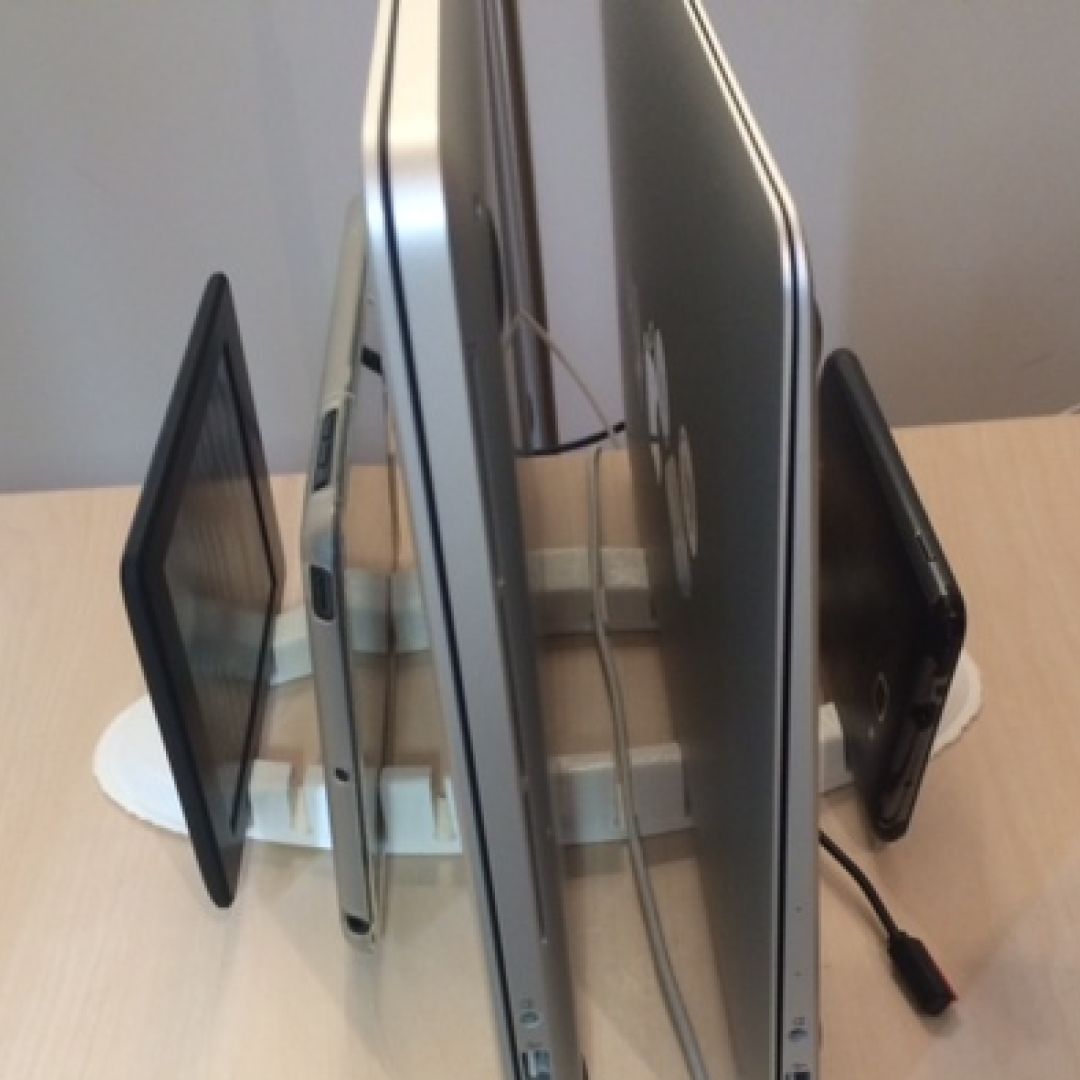 Verticale standaard voor het vasthouden van 5 Apple-apparaten. Bijv. een Macbook Pro Retina 15, Macbook Air 13, Kindle Paperwhite, iPad en iPad mini. Heeft ook kabelgoten zodat de oplaadkabels niet van het bureau vliegen wanneer je de stekker eruit trekt.