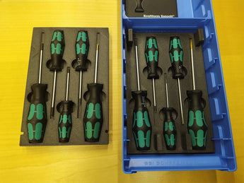 Deze stapelbare bak is ontworpen om uw schroevendraaiers efficiënt te organiseren. Hij is specifiek aangepast om de drie primaire maten WERA handgrepen en klinglengtes te bevatten. Elke bak kan 2 grote (kling 100 mm, handgreep 98 mm), 2 middelgrote (kling 80 mm, handgreep 81 mm) en 1 kleine schroevendraaier (kling 60 mm, handgreep 70 mm) bevatten.