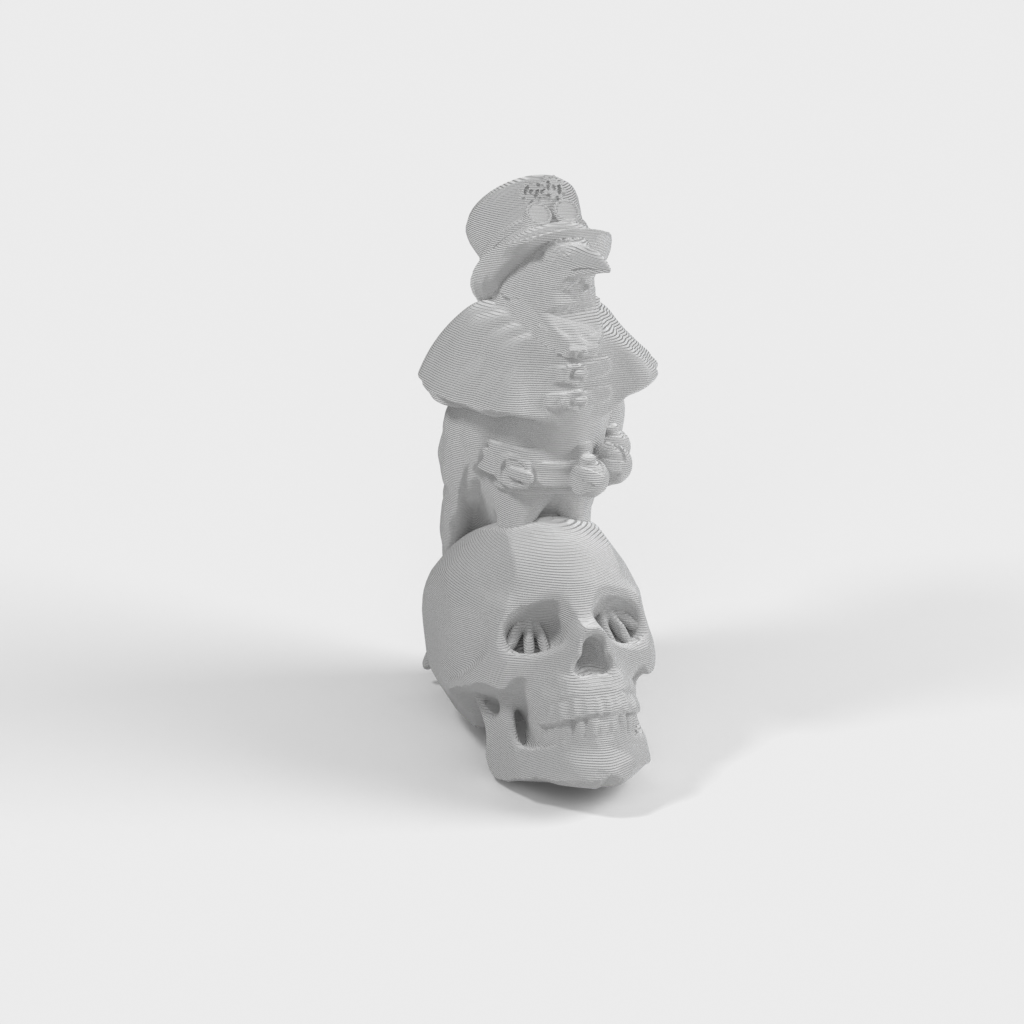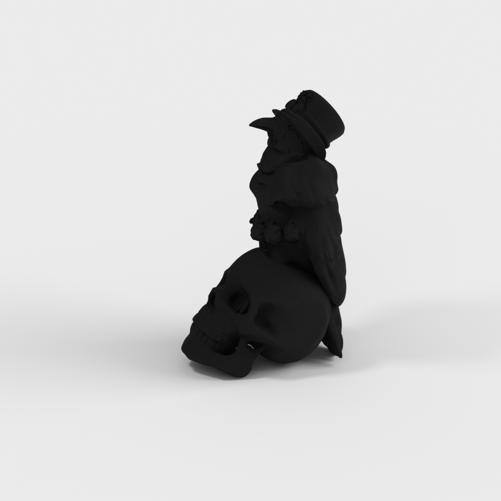 Deze unieke figuur toont een indrukwekkende kraai, gekleed in gedetailleerde steampunk-geïnspireerde kleding. De veren van de vogel zijn kunstig vervaardigd om op uurwerktandwielen en mechanismen te lijken, terwijl de metalen hoge hoed en bril een vleugje industriële verfijning toevoegen. De kraai zit majestueus op een menselijke schedel, die is ontworpen met fijne details die de gotische en mystieke uitdrukking versterken.