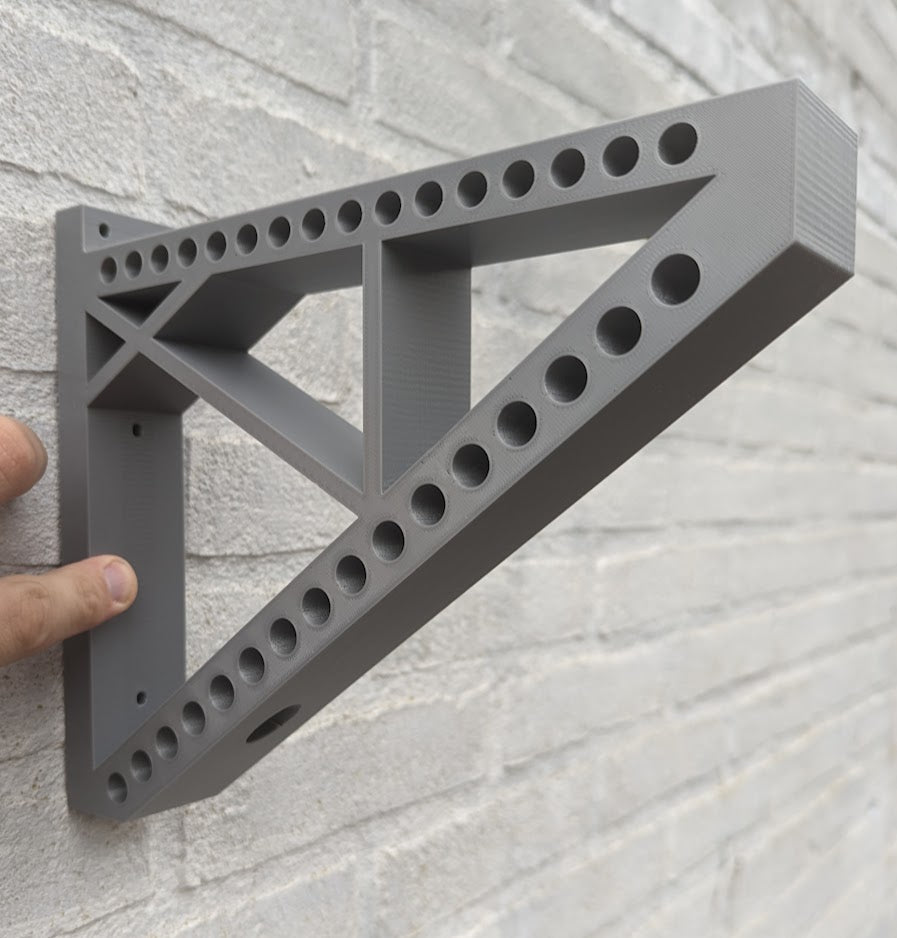 U heeft ook de mogelijkheid om geprinte plankbeugels toe te voegen, die een stabiele ondersteuning bieden voor uw planken. Dit muuranker is ideaal voor het creëren van een georganiseerde ruimte in elke kamer, van de woonkamer tot de werkplaats, en kan alles dragen, van boeken en opbergdozen tot uw favoriete decoratieobjecten en decoraties. De multifunctionele constructie met extra gaten biedt ook mogelijkheden voor toekomstige aanpassingen, bijvoorbeeld het bevestigen van touwen van het plafond om langere objecten zoals staven of planken vast te zetten.
