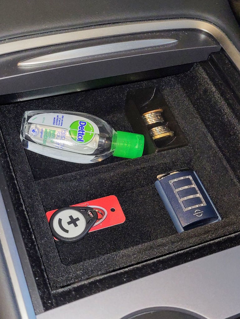 Een klein muntenbakje dat in de hoek van de voorste Tesla Model 3/Y ververste consolebakjes past. Er passen munten in met een diameter tot 27 mm.