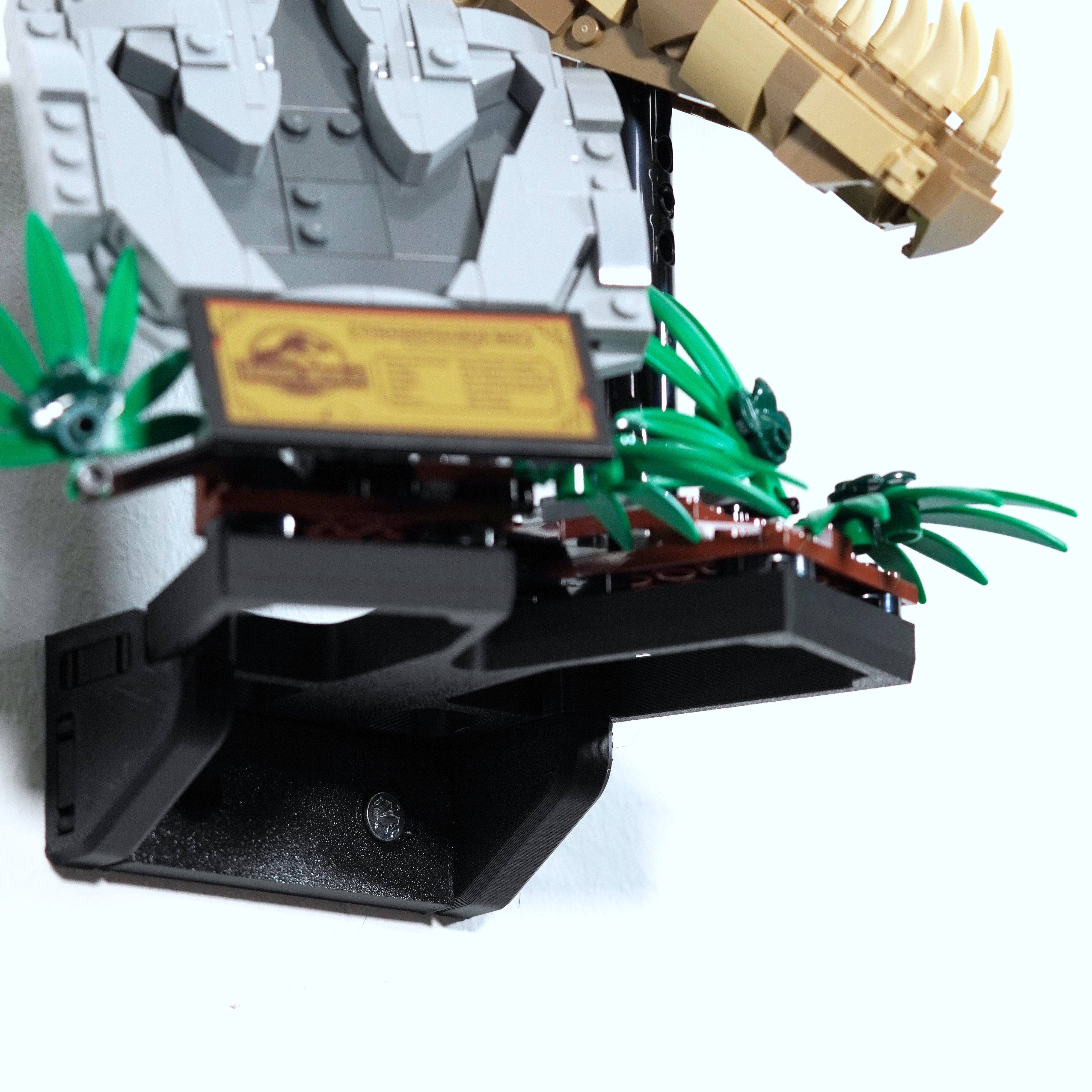 Krijg een veilige presentatie van uw LEGO Jurassic World T-Rex schedel met deze wandhouder. Hij houdt het model stevig vast met behulp van speciale noppen, zodat het stabiel hangt, maar toch gemakkelijk kan worden verwijderd indien nodig. De houder wordt eenvoudig met twee schroeven aan de muur bevestigd.