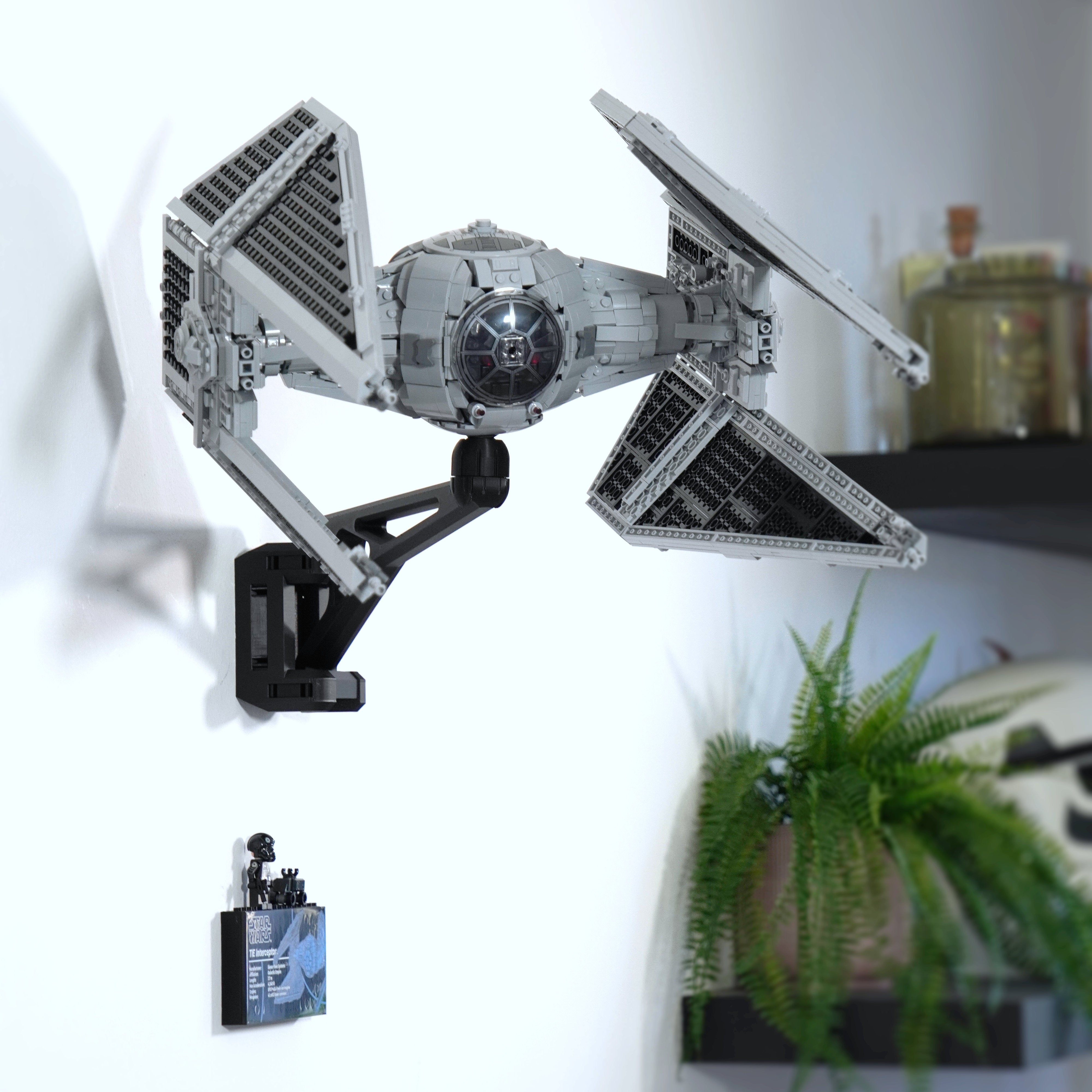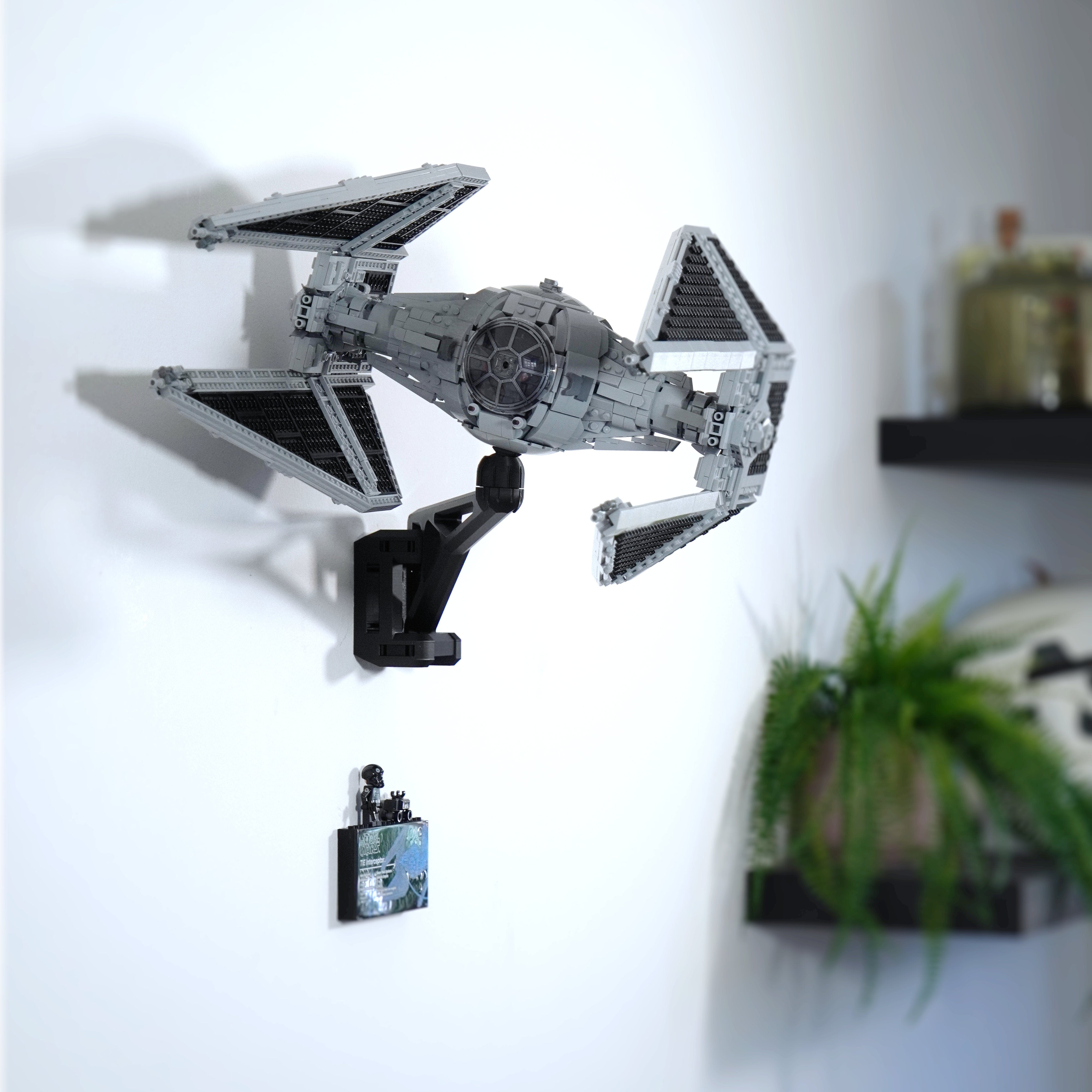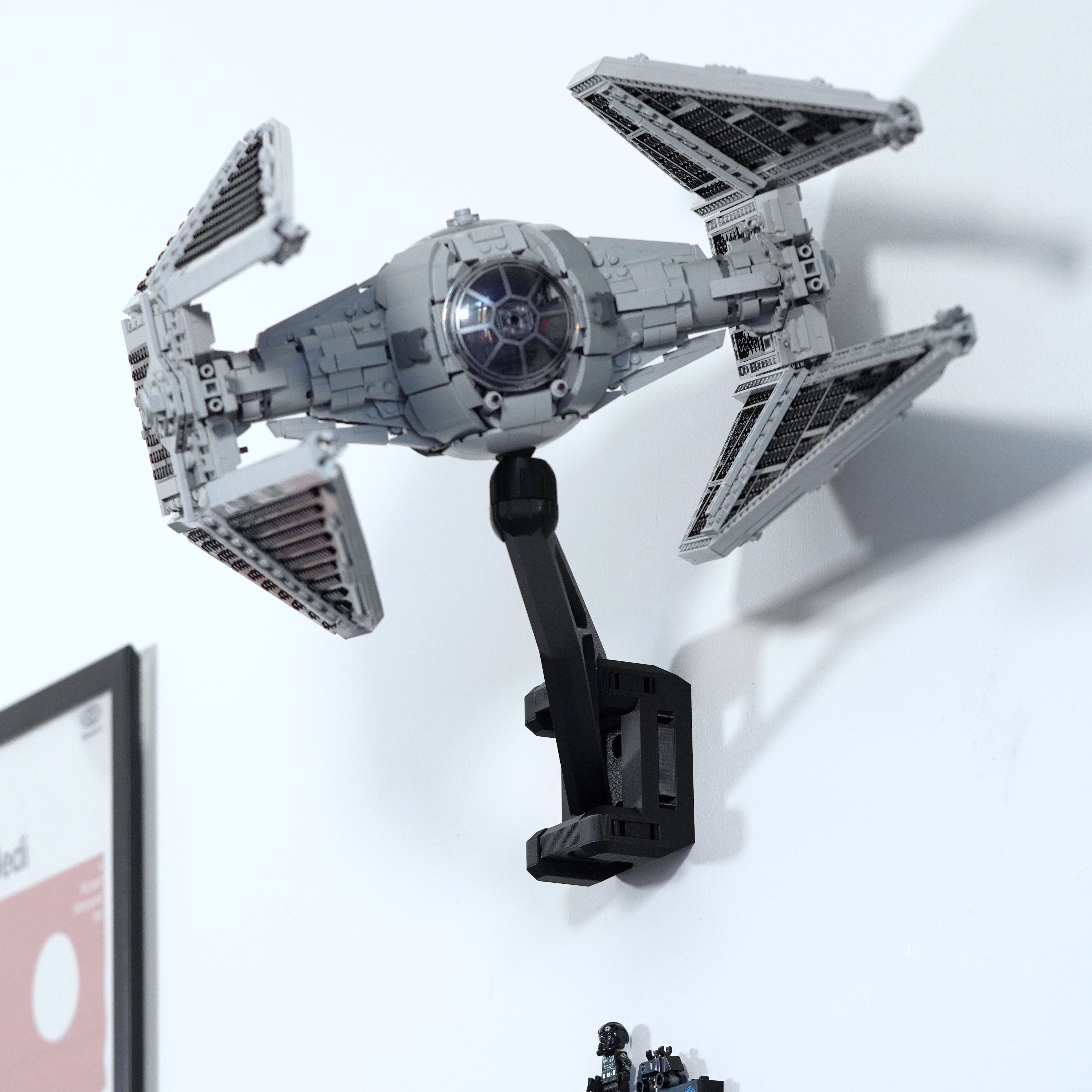 Deze verstelbare wandsteun toont uw UCS Tie Interceptor veilig en elegant. Hij heeft een draaibare arm en kogelgewrichten die veelzijdige hoeken en posities mogelijk maken. De oplossing omvat ook een aparte houder voor de informatieplaat en minifiguren, wat zorgt voor een complete presentatie van uw verzameling.