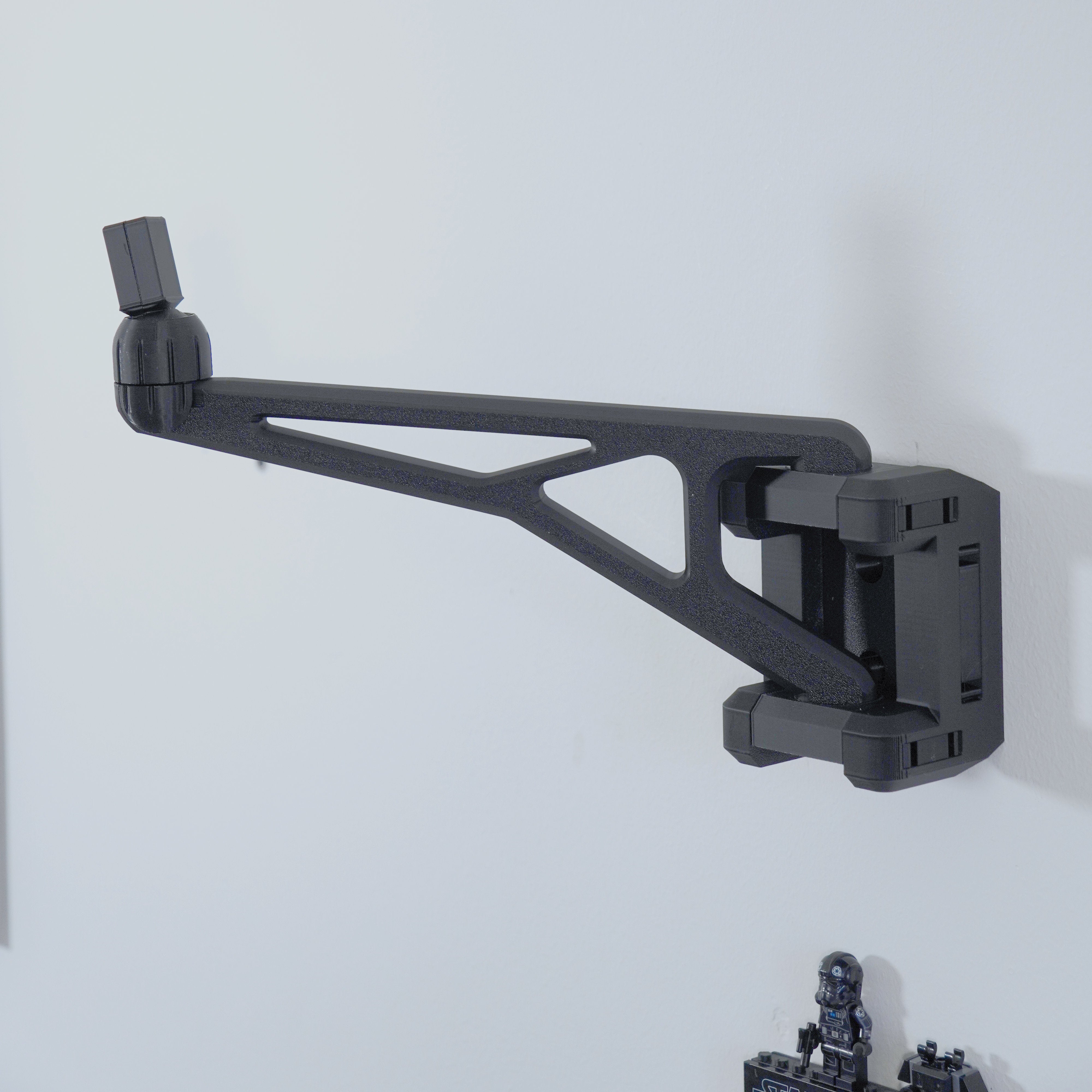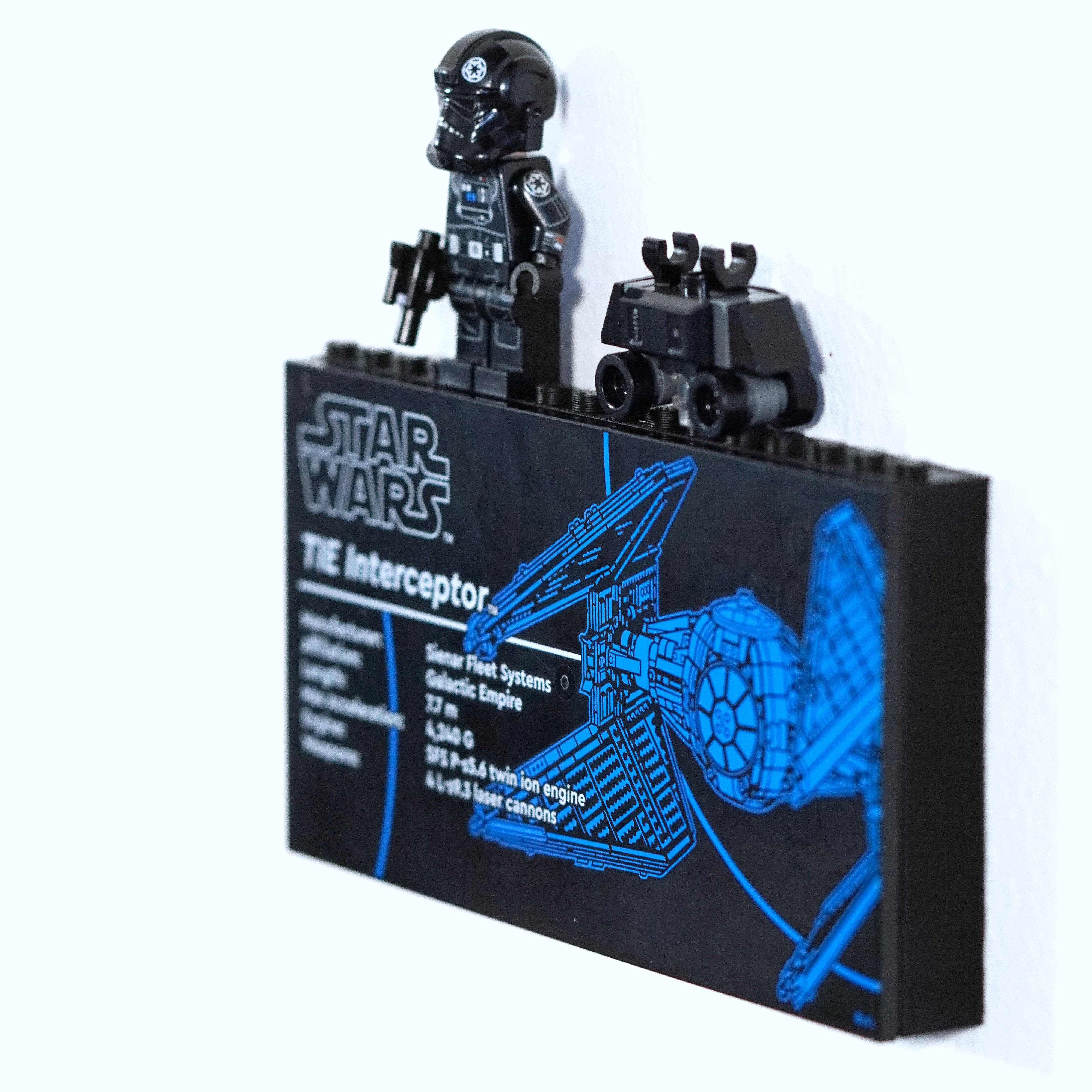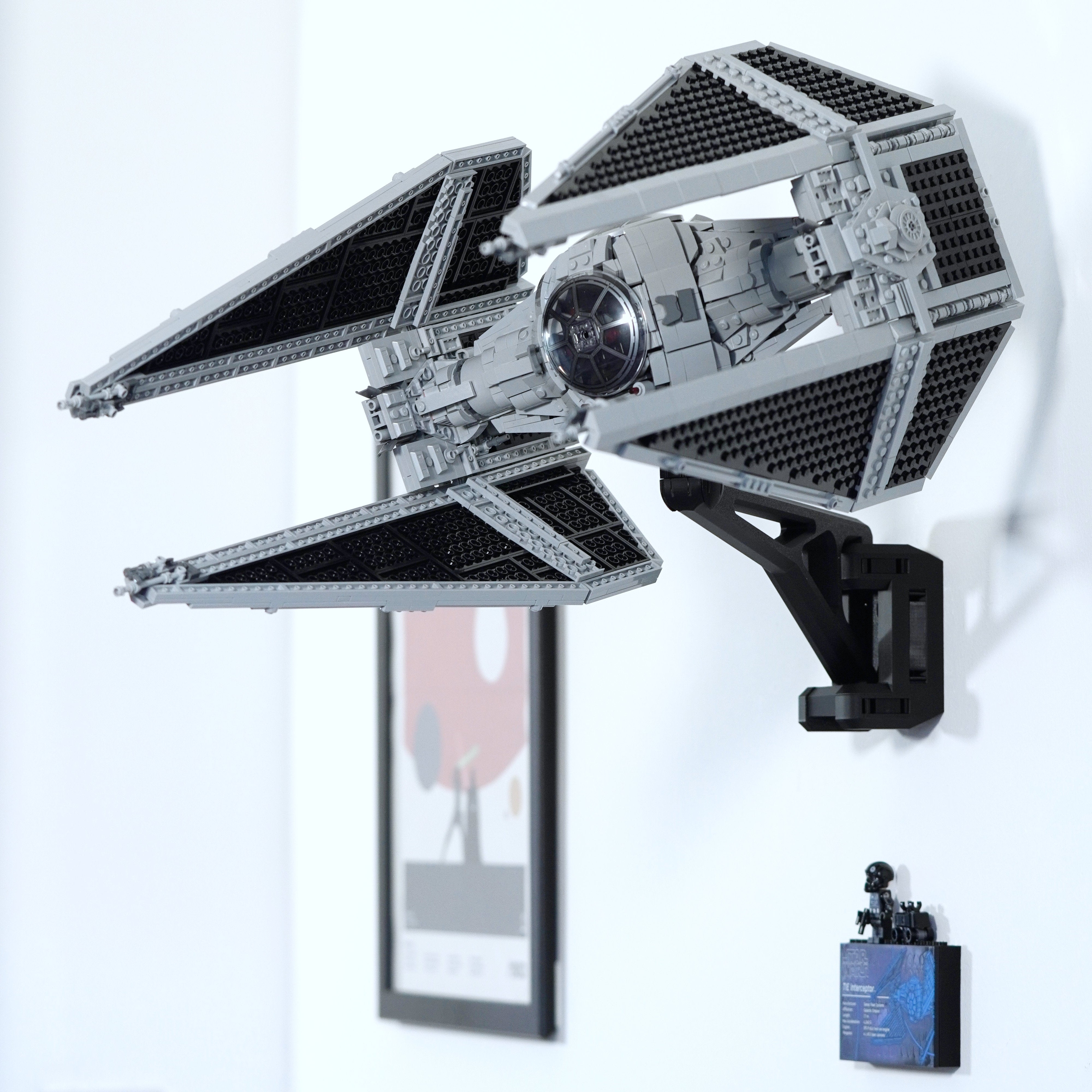 Deze verstelbare wandsteun toont uw UCS Tie Interceptor veilig en elegant. Hij heeft een draaibare arm en kogelgewrichten die veelzijdige hoeken en posities mogelijk maken. De oplossing omvat ook een aparte houder voor de informatieplaat en minifiguren, wat zorgt voor een complete presentatie van uw verzameling.