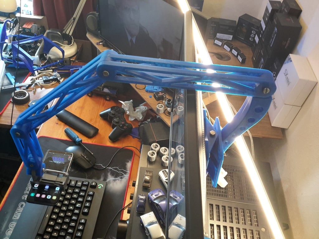 De houder is uitgerust met een robuuste, verstelbare arm die bestaat uit modulaire secties. Deze zijn aanpasbaar in zowel lengte als stijfheid, zodat u uw telefoon nauwkeurig kunt plaatsen, zelfs achter grotere schermen, en de perfecte hoek kunt bereiken. Een geïntegreerd rotatiegewricht geeft u volledige controle over de richting van de telefoon, omhoog en omlaag, en van links naar rechts.