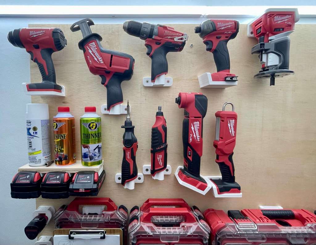 Een wandmontage voor Milwaukee M18-gereedschap. Met deze montage kun je je Milwaukee M18-gereedschap eenvoudig aan de muur opbergen en zo je werkplaats, schuur of werkruimte overzichtelijker maken.