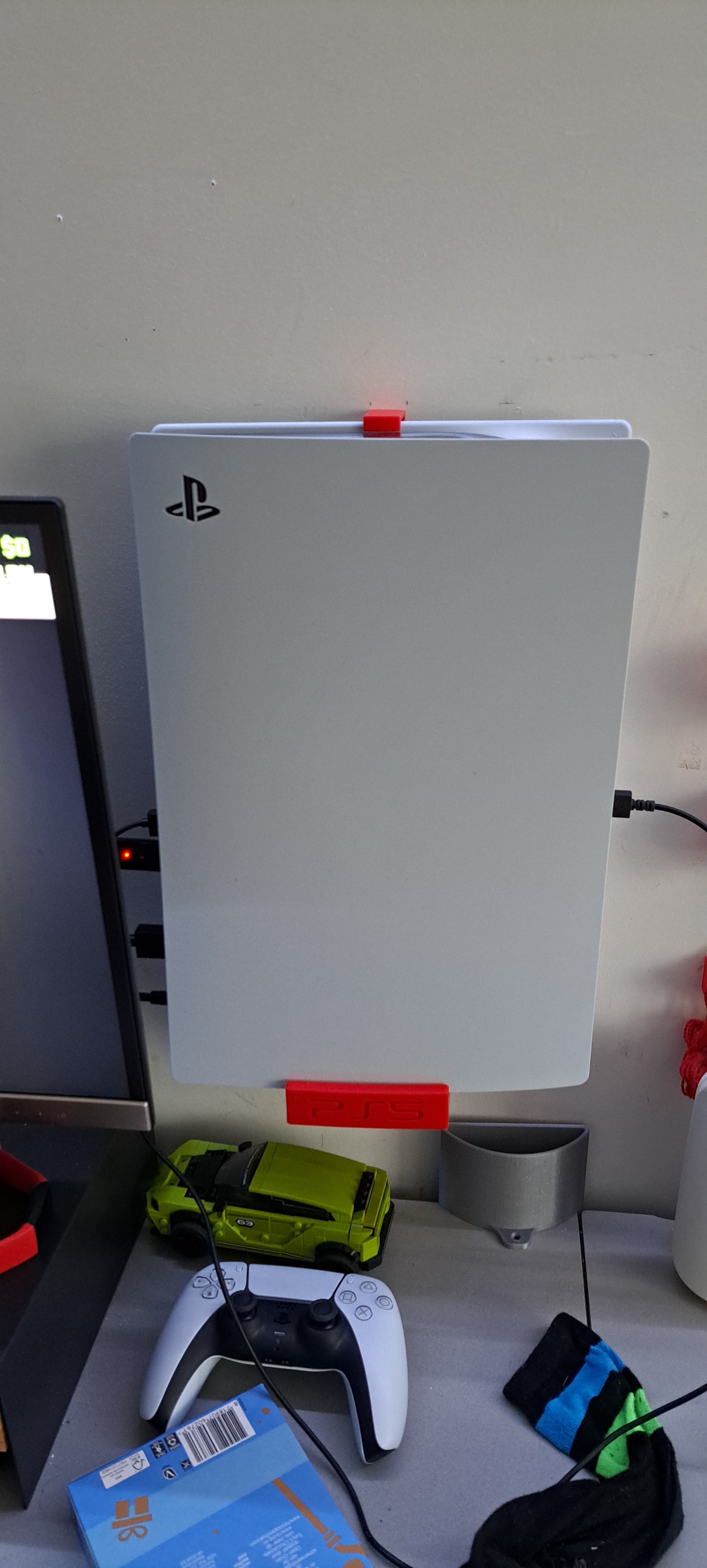 Het ontwerp van de montage is geoptimaliseerd om uw console veilig op zijn plaats te houden en te voorkomen dat deze omvalt, vooral wanneer u accessoires zoals een controllerstandaard aan het voorpaneel toevoegt. De standaardoriëntatie plaatst het PS5-logo zichtbaar naar voren, met de kabels naar de linkerkant gericht. Mocht u een alternatieve opstelling wensen, dan kan de montage worden gespiegeld, zodat het PS5-logo naar de muur is gericht, wat flexibiliteit geeft in uw inrichting.