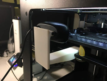 De montage hergebruikt de bestaande plastic basis en schroef van uw Logitech C270 camera, waardoor de installatie eenvoudig is. Hij glijdt moeiteloos op en wordt veilig bevestigd aan het frame van de printer net onder het bouwplatform. Voor het scherpste beeld wordt aanbevolen om de handmatige focus van de camera aan te passen aan de afstand tot het printgebied.