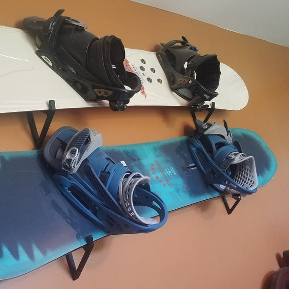 Deze Snowboard Wall Mount is eenvoudig te installeren en is buitengewoon sterk. Het ontwerp draagt het meeste gewicht over naar het frame, in plaats van een grote belasting dicht bij de schroef te leggen, zoals te zien is bij andere ontwerpen. Dit betekent dat er maar één schroef in een muurstijl nodig is. De twee snowboards die zijn afgebeeld hangen al meer dan een jaar, en toch slaap ik er rustig onder.