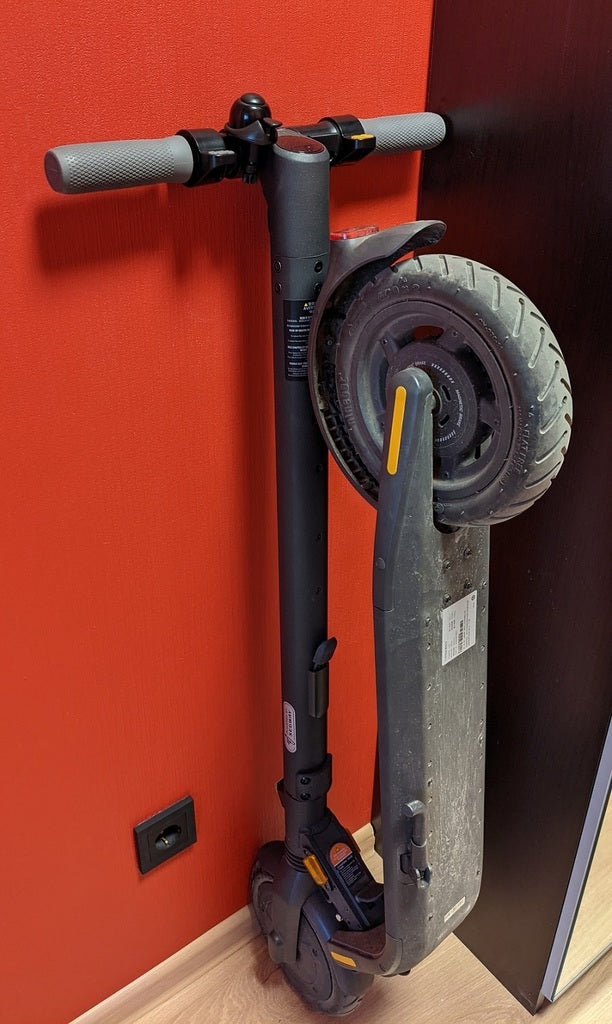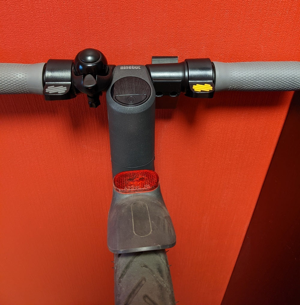 Eenvoudige 3D-geprinte muurbeugel voor Ninebot e25, zodat deze tegen de muur kan staan en zo min mogelijk ruimte inneemt.